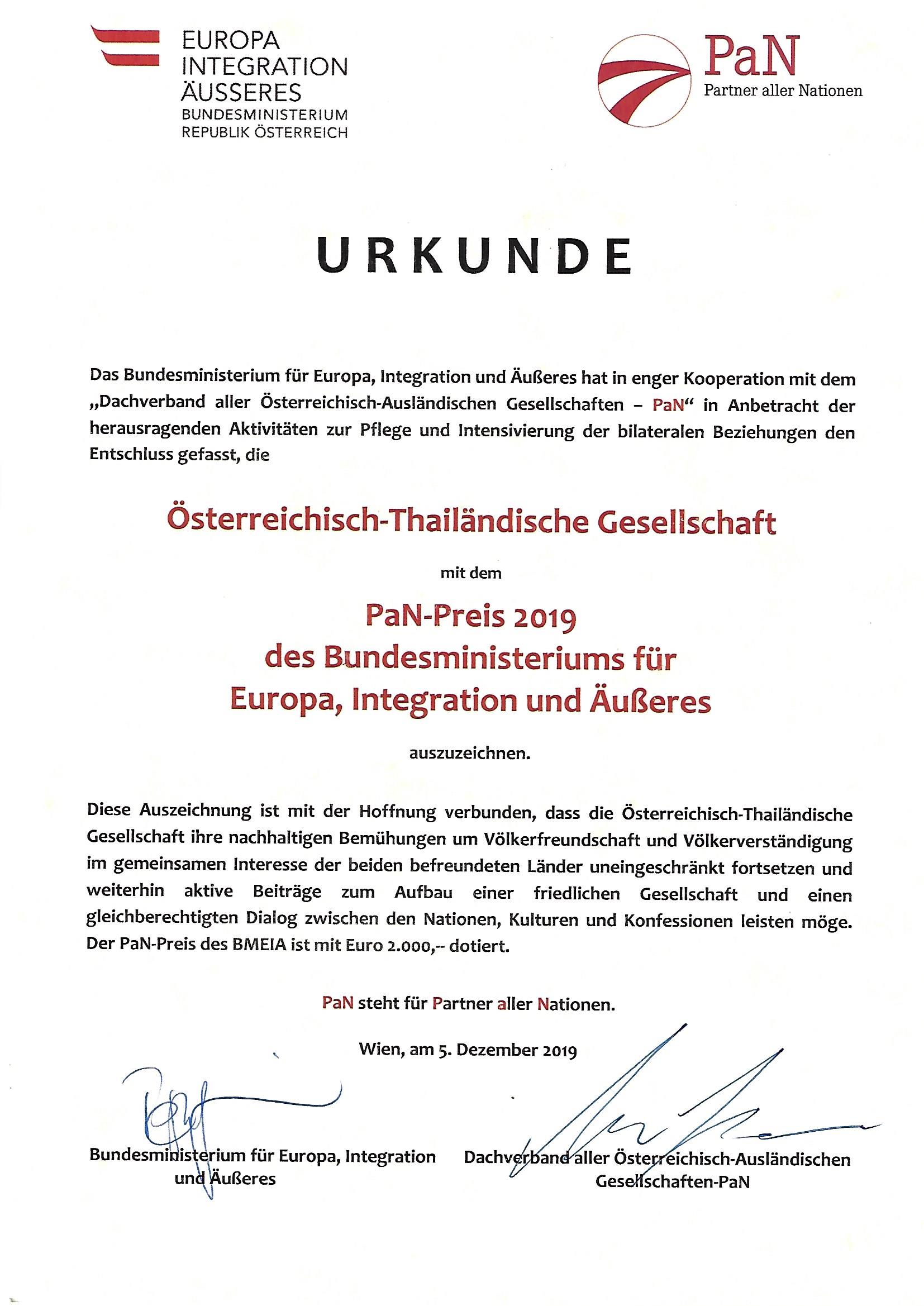 Diese Auszeichnungen sind mit der Hoffnung verbunden, dass die Österreichisch-Thailändische Gesellschaft ihre nachhaltigen Bemühungen um Völkerfreundschaft und Völkerverständigung im gemeinsamen Interesse beider befreundeten Länder uneingeschränkt fortsetzen und weiterhin gleiche Beiträge zum Aufbau einer friedlichen Gesellschaft und einen gleichberechtigten Dialog zwischen den Nationen, Kulturen und Konfessionen leisten möge.